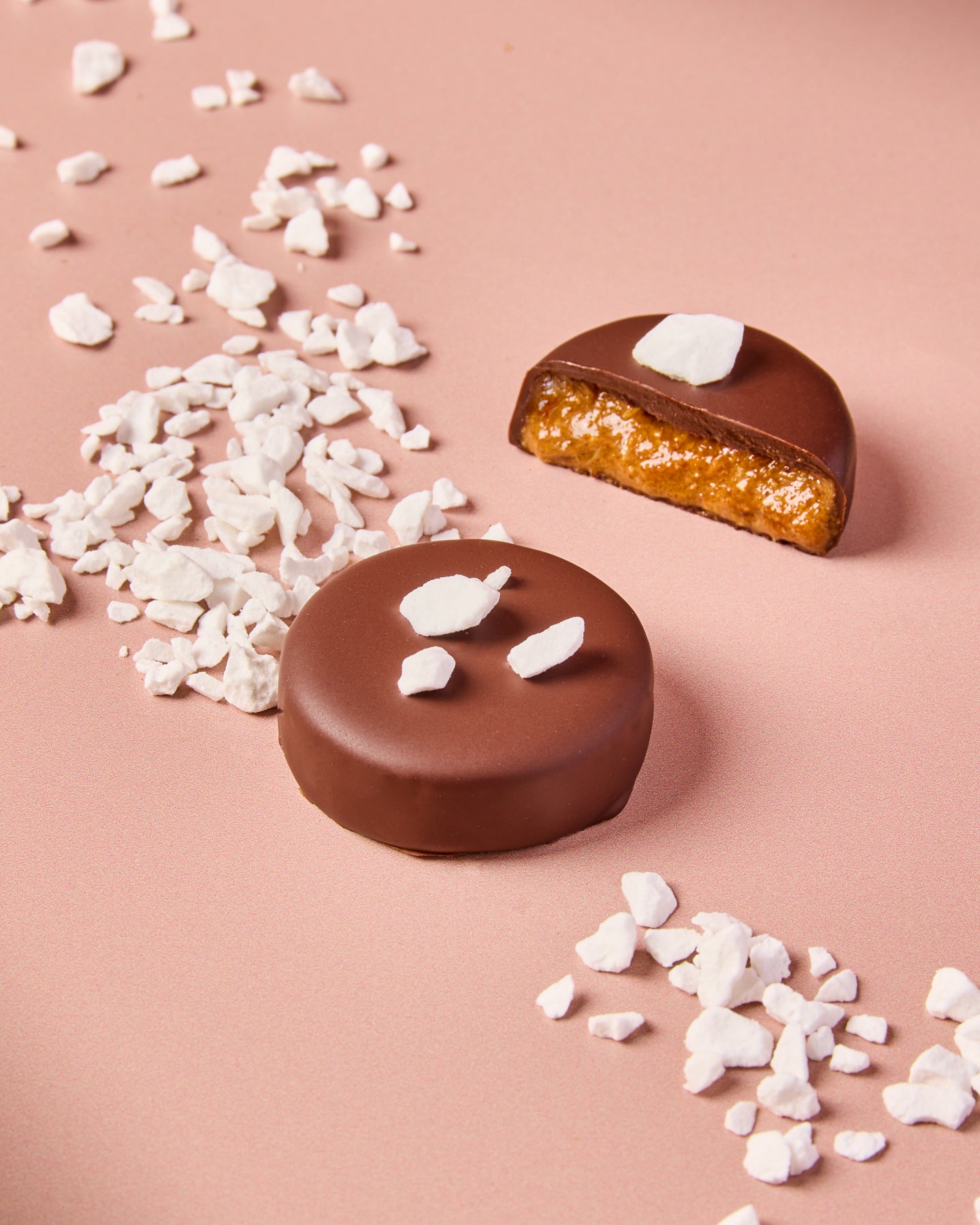 Bouchée pralinée coco : Insert praliné coco croustillant, enrobage chocolat noir, noix de coco lyophilisée - Valeur énergétique : 2287 Kj soit 551 Kcal, matières grasses 40 g dont AG saturés 20 g, glucides 34 g dont sucres 28 g, protéines 9,4 g, sel 0 g