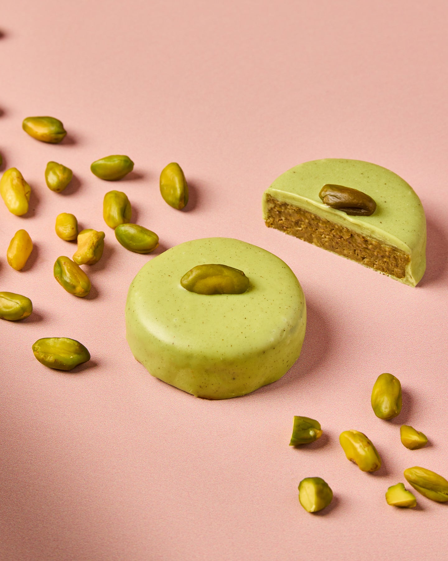 Bouchée pralinée pistache : Insert praliné amande pistache croustillant, enrobage chocolat blanc coloré, pistache entière - Valeur énergétique : 1945 Kj soit 467 Kcal, matières grasses 29 g dont AG saturés 11 g, glucides 43 g dont sucres 39 g, protéines 6.8 g, sel 0.1 g